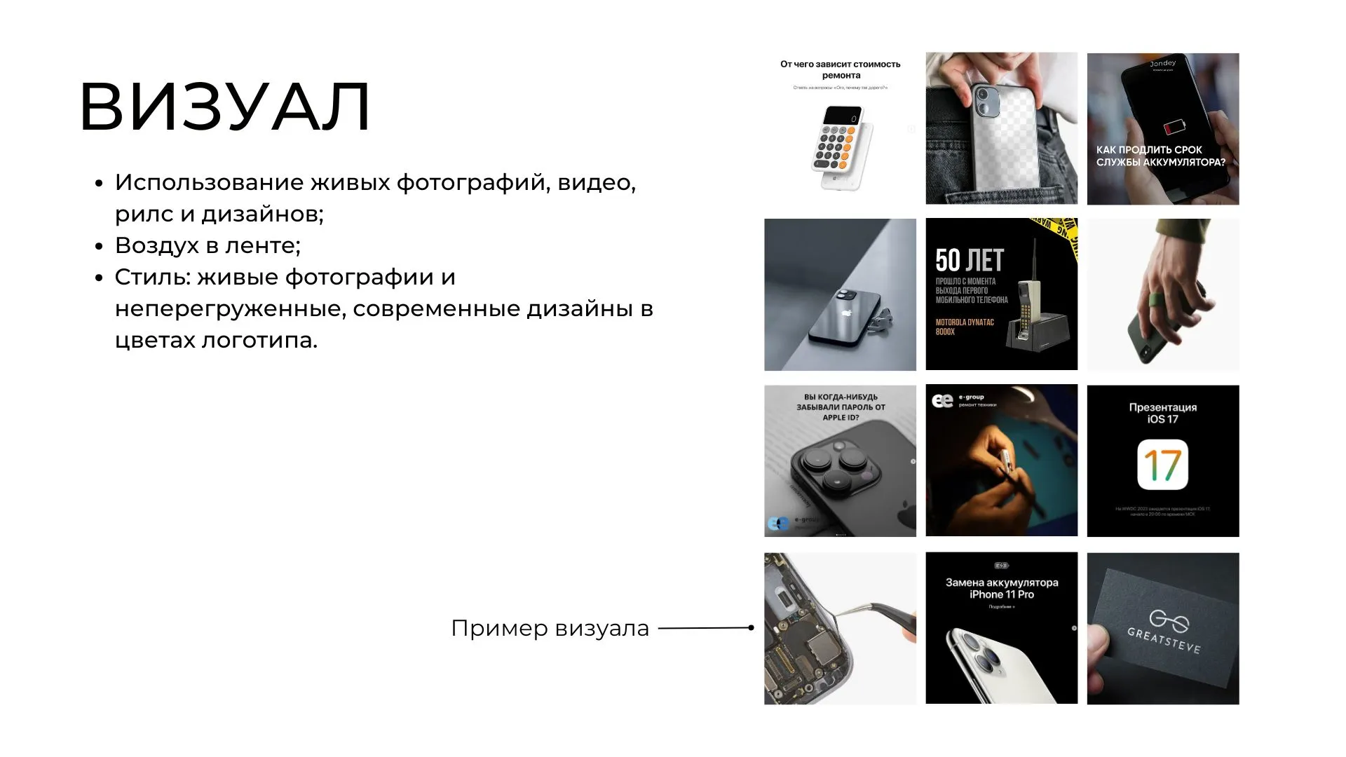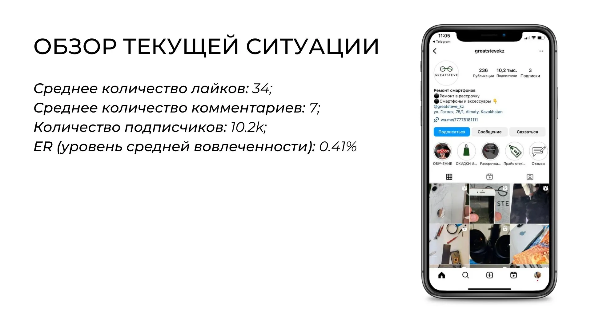 Перевыполнив задачу по привлечению клиентов на ремонт, стратегию полностью изменили и сделали упор на продажу б/у смартфонов. Поэтому мы сместили акцент с ремонта на продажу смартфонов, увеличив количество фото и видео с демонстрацией продукции, сделали рубрики о б/у iPhone, их преимуществах, особенностях и рекомендациях по выбору.